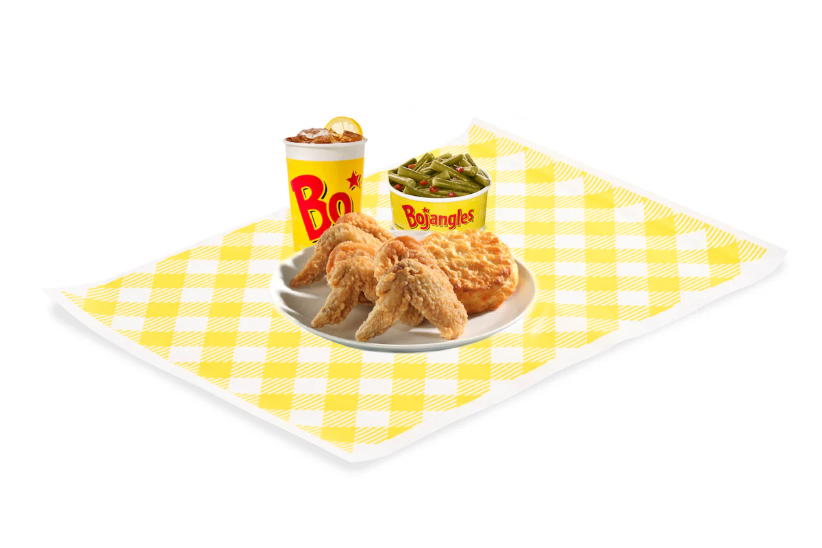 3 boldly seasoned wings, served with 1 home-style fixin’, a made from scratch buttermilk biscuit, and your choice of beverage.